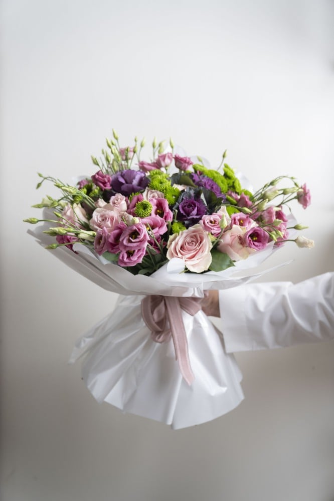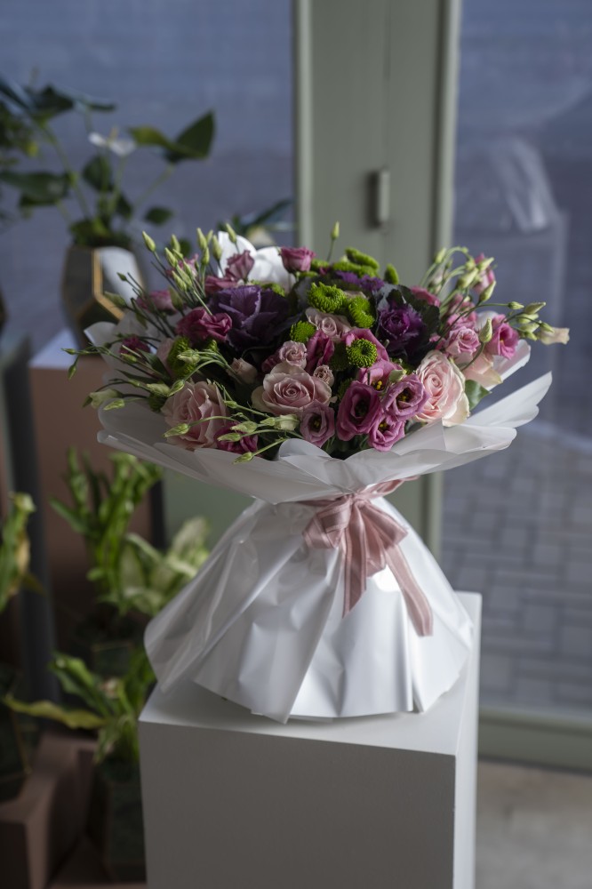 التي تجمع بين درجات الأرجواني والوردي الناعمة مع لمسات من الزهور الخضراء المنعشة.
