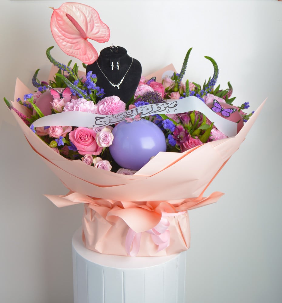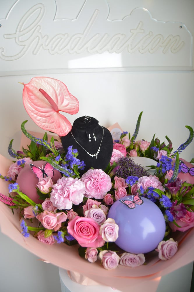 إضافةً إلى لمسات إبداعية مثل بالونات الزينة وعبارات التهنئة، مما يجعله الهدية المثالية لكل خريج وخريجة.